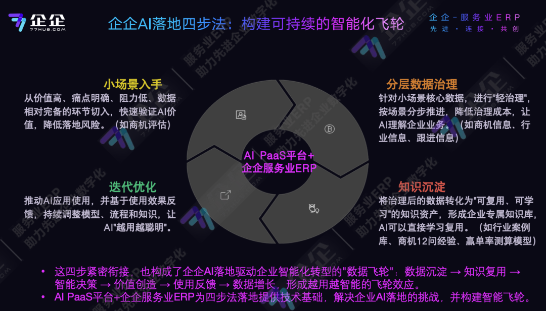 企企科技的AI战略核心,是以ERP为数据源,以AI PaaS为智能引擎,构建服务业的智能化管理体系。