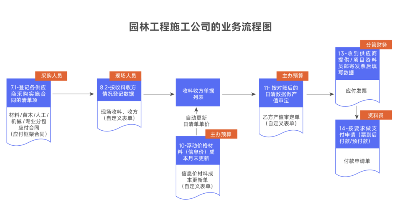 智元平台会根据客户发展,公司管理需求变化,搭建相关的个性化表单,提供相关功能等,与企企服务业ERP一同帮助客户实现数字化管理升级。我们以演艺公司、园林工程施工公司为例: