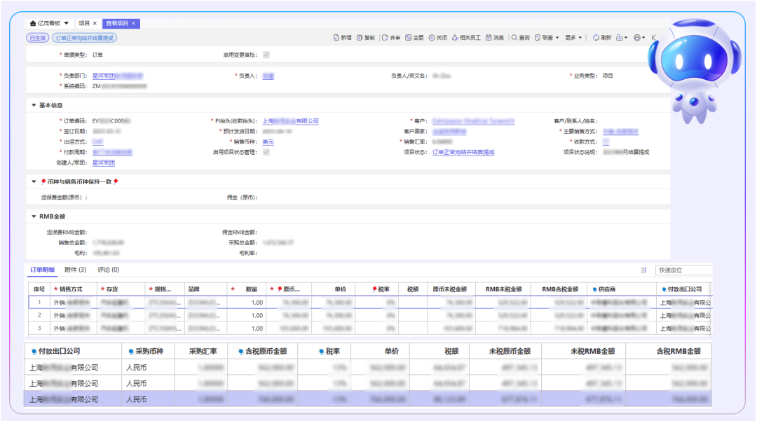 “这个行业有一个特点就是销售、采购,同一个人,以销定产!我们有200多个业务员,他们既是采购也是销售,要从头盯到尾。目前已经实现了一个大订单的管理模式:左边就是给客户的销售金额,右边就是我们的采购金额,完全在一个界面。业务员随时都能看到订单的利润情况,这个订单能赚多少钱,业务员心里是有数的。钱流就是心流,对他们有用,就是系统推进最好的动力。”