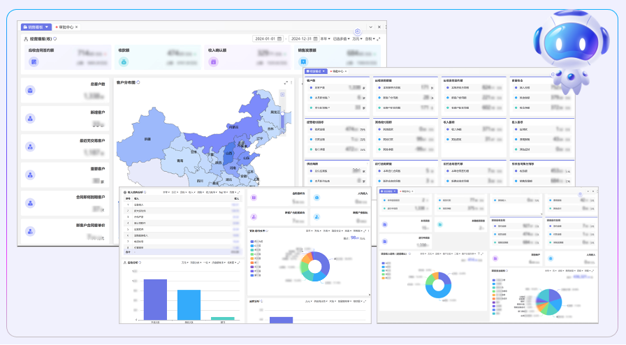 在企企服务业ERP系统里,实现多维度数据分析:满足内部管理层多维度报表分析及看板展示,如:合同执行分析、项目执行分析、客商往来表、客户分布图以及经营、项目、销售、财务看板,为管理层提供数据支撑与决策依据。