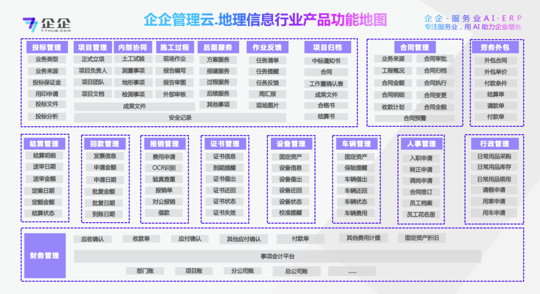 正是基于对服务业本质的深刻理解,企企科技围绕客户、项目、资源与利润设计了一整套服务业原生的经营系统。谢桂霞结合方宇的实际场景,展示了企企针对地理信息与工程勘测行业的完整解决方案蓝图——从投标管理、项目立项、现场作业、报告编写到结算回款的全业务流程覆盖,以及基于智元PaaS平台构建的证照管理、设备管理、车辆管理、人事管理等个性化应用。