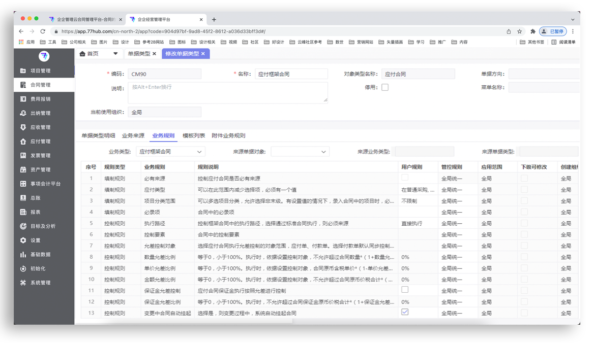 企企服务业ERP合同管控规则设置热门功能