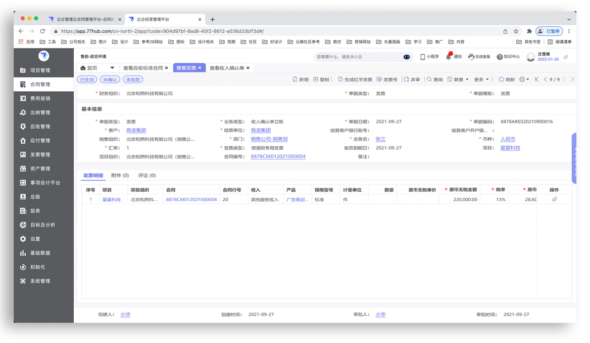 企企服务业ERP支持录入标准合同或框架合同;支持设定应收合同立账方式、 允差控制、框架合同录入项等控制规则。