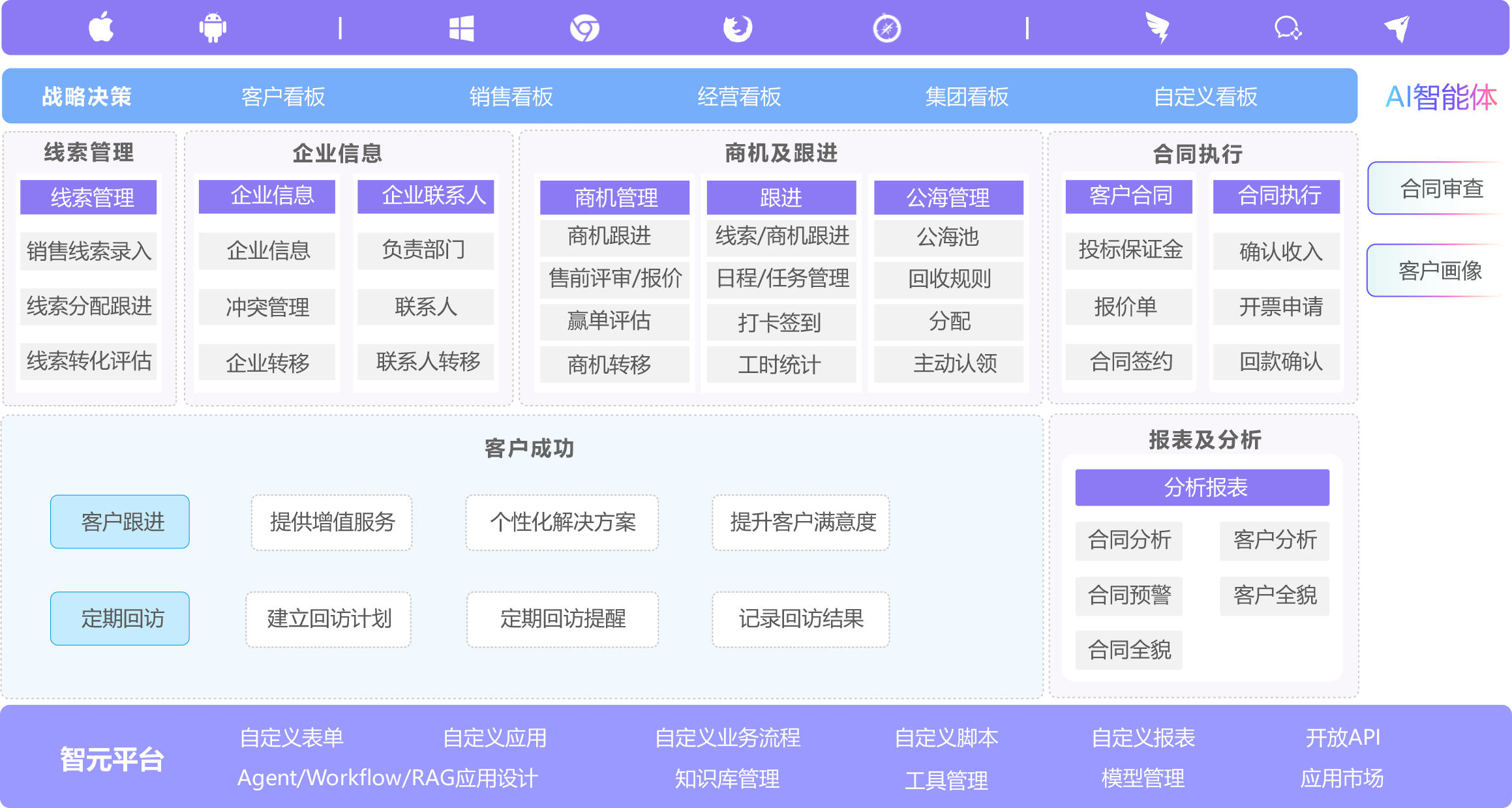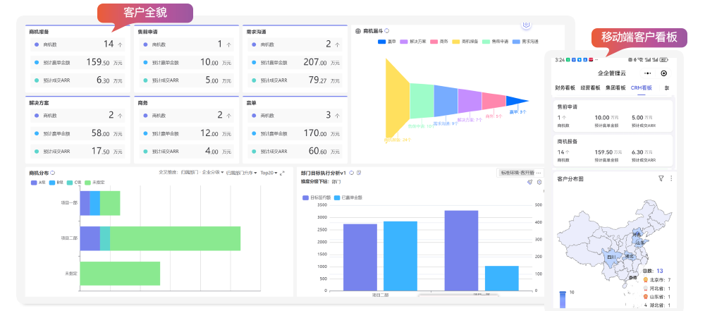 客户全貌功能整合了客户的销售机会、需求跟进、合同履约及历史交易等多维数据,构建360°全景客户视图。通过实时动态的可视化报表,帮助客户深入洞察客户行为和需求变化,提升销售精准度和客户服务质量,实现科学管理与高效决策,最终促进客户关系的稳固与业务增长。