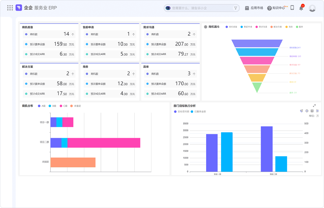 实现从上到下的管理目标一致:使用企企一套系统,打通业财数据,从而实现管理上口径统一,方法统一,从而规范管理流程,将管理关键点用企企服务业ERP固化,充分发挥企业各部门之间的协同,尤其是财务部门与业务各部门之间的协同。