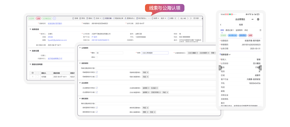 线索可自动生成企业、联系人及商机,并实现与客户公海池的自动关联;公海规则支持灵活收回,多规则设置下既可由管理员分派,也允许用户自主认领。