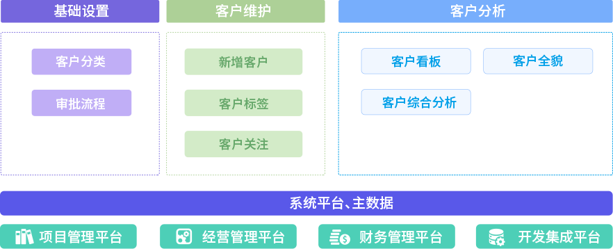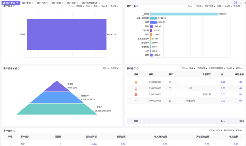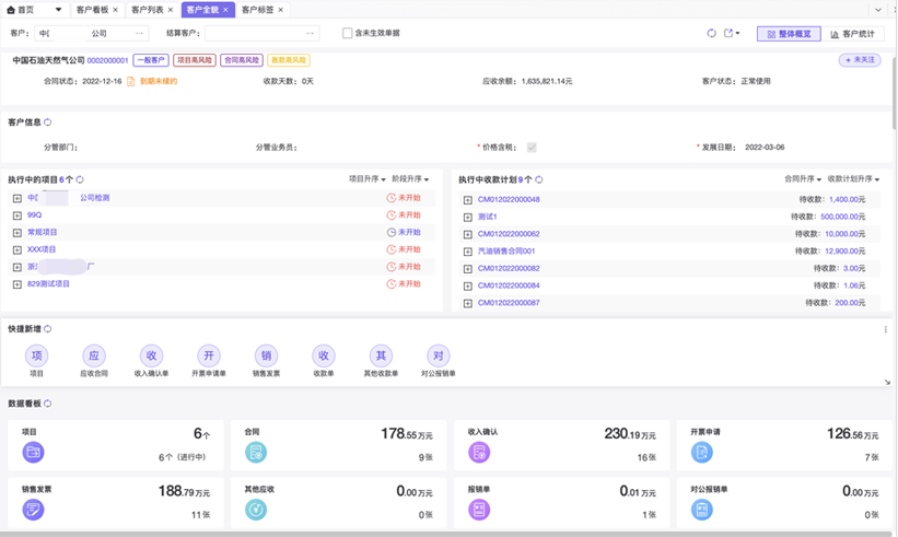 集中呈现与客户相关的项目、合同、收入、收款等信息