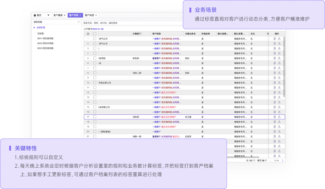 通过标签直观对客户进行动态分类,方便客户精准维护;标签规则可以自定义;支持自动标签与自定义标签。