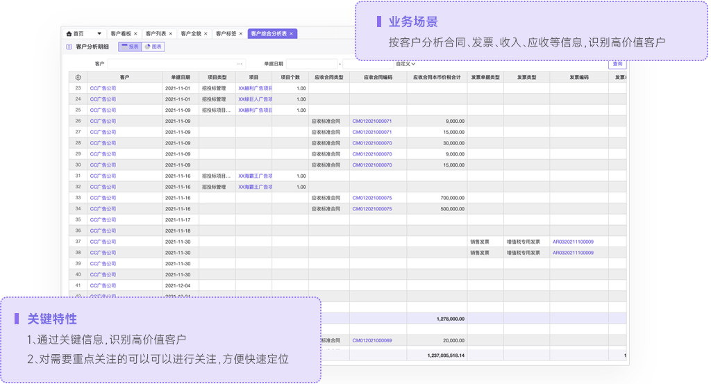 按客户分析合同、发票、收入、应收等信息,识别高价值客户;通过关键信息,识别高价值客户;对需要重点关注的可以可以进行关注,方便快速定位。