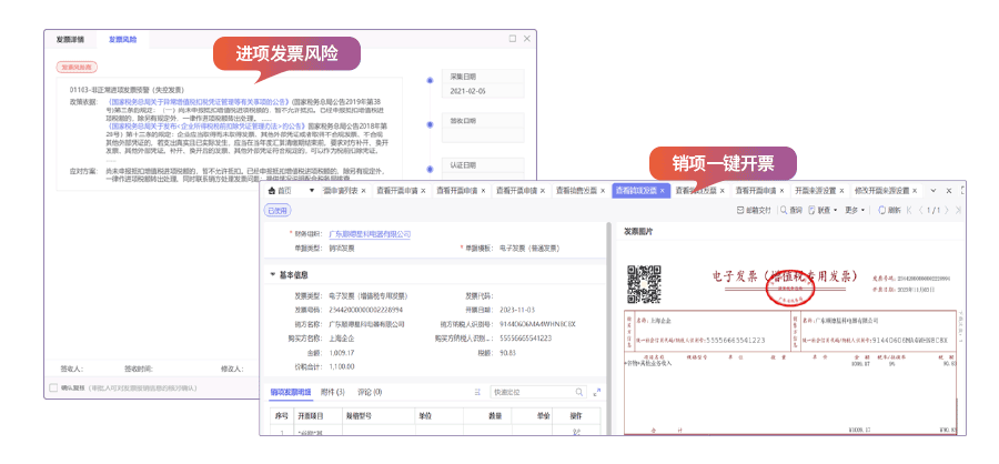 进项发票管理支持发票全生命周期状态监控与风险提醒,建立发票池记录报销状态,实现自动认证与异常预警;开票申请自动触发税票开具,信息回传销售单据并关联电子源文件,实现税票一键开具与自动归档交付。