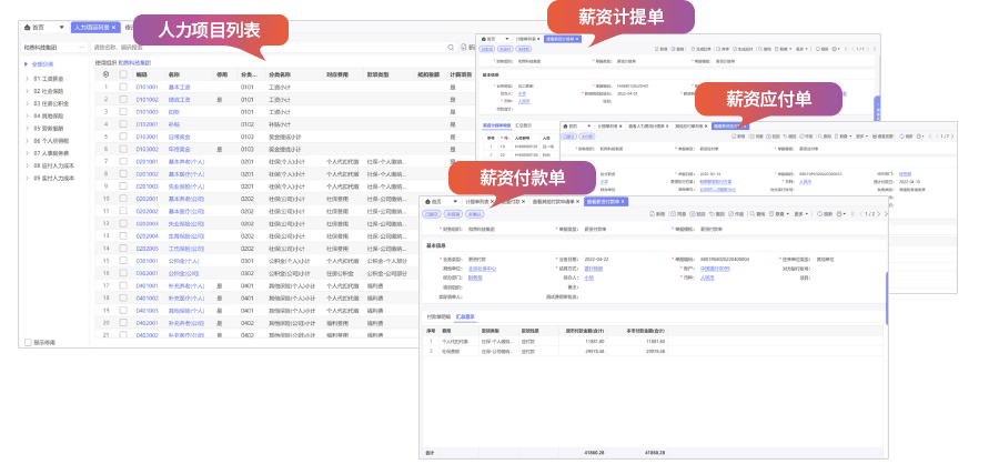 根据企业用工和薪资结构情况,灵活定义薪资成本费用计提方式。通过输入或导入薪资数据,系统自动生成相关单据和财务凭证,提高财务工作效率。促进人力项目标准规范,保证业务流程完整,确保相关数据统计分析的准确性和及时性。