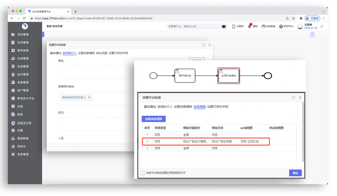 流程驱动业务不同环节的进行,通过审批流程节点设置审批视图,满足不同业务环节的审批人对业务单据可填写内容、可见内容等不同的要求。