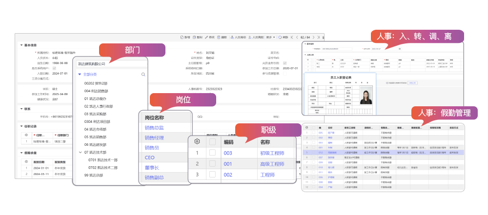全面人员档案库,部门架构、岗位职责管理、职级体系维护;覆盖员工全周期的流程,包括入、转、调、离;支持多类型假期配置,集成可视化日历管理,提供灵活在线请假/销假审批,实现全周期记录留痕,提升管理效率与合规透明。
