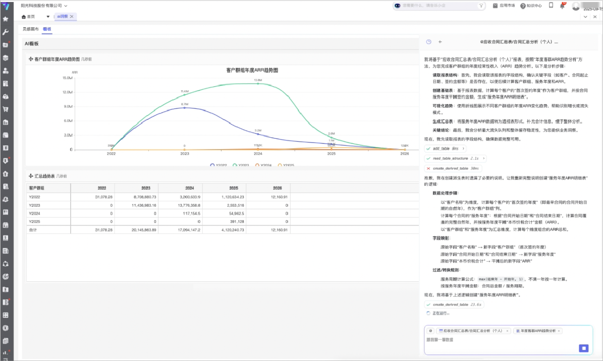 基于客户合同与增购数据,支持自然语言查询客户回款/续费计划、应续详情和用户数模块合并计算。