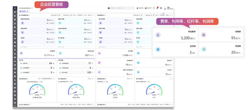 企企服务业ERP战略决策平台提供全面的财务和经营指标,如利润率、费率、杠杆率、利用率等,自动计算并智能分析,帮助管理层基于事实数据做出战略决策。避免凭经验决策的风险,提高管理决策的科学性和精准度。