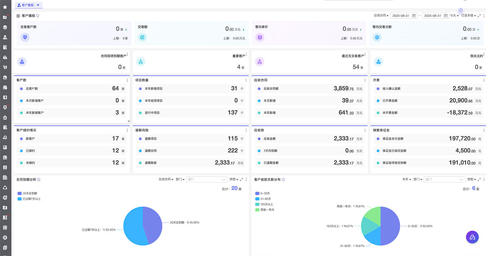 集中展示客户总量、分类、生命周期与价值贡献,直观呈现新增、活跃、流失趋势,帮助企业深度洞察客户结构,发现潜在高价值客户,优化营销策略与服务方式,提升客户满意度与长期合作价值。