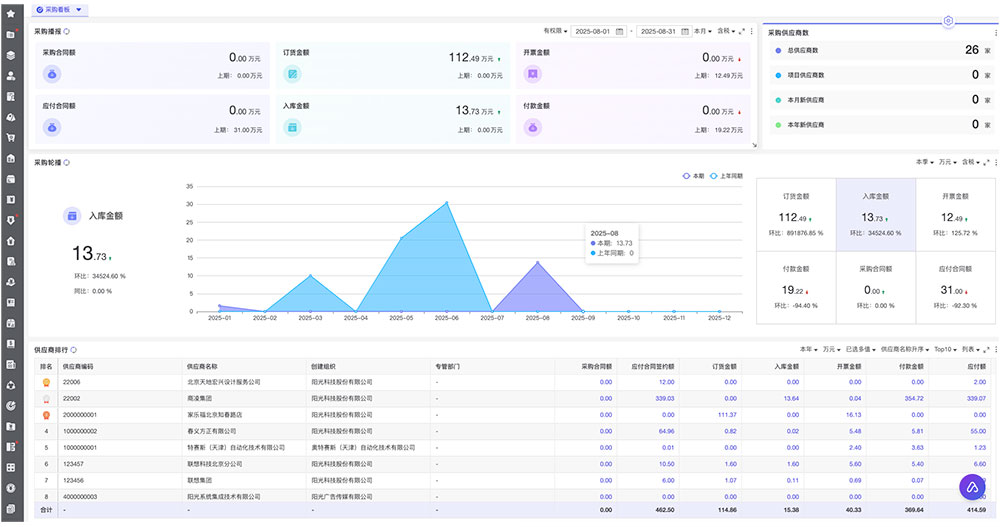 覆盖采购计划、订单执行、供应商表现与付款进度,直观呈现采购成本与合规情况。帮助企业监控供应链执行效率,优化供应商管理,降低物料成本与采购风险,确保物资及时供应并支持业务高效运转。
