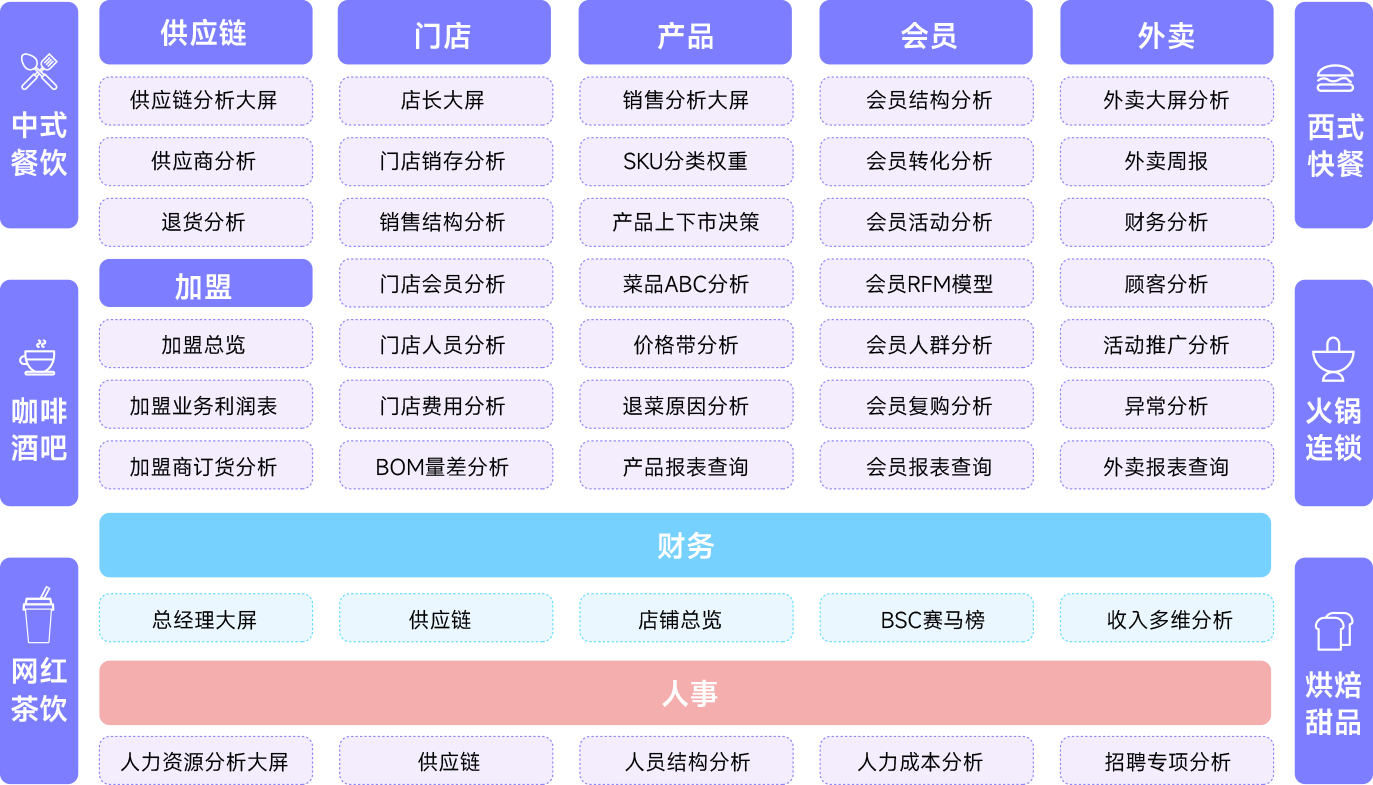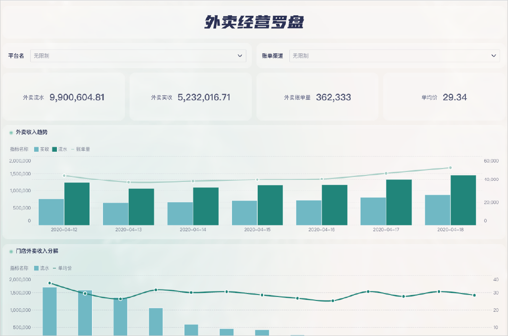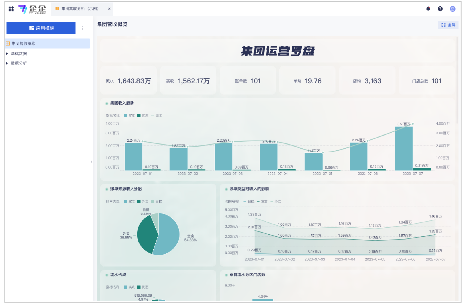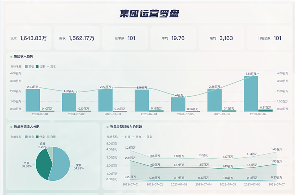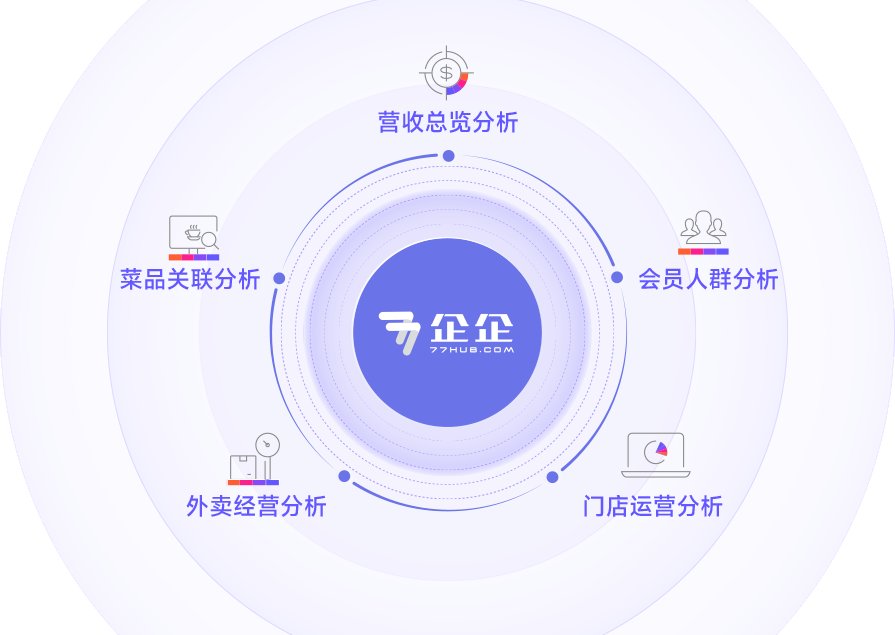 提供综合数据分析功能,涵盖线下门店营收、店铺客流、外卖销量等多维度数据,全方位帮助餐饮企业解析餐饮市场竞争格局,及时制定有效的运营策略。