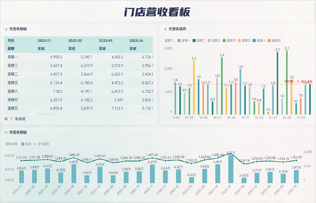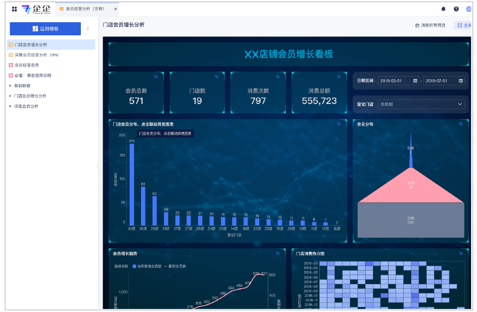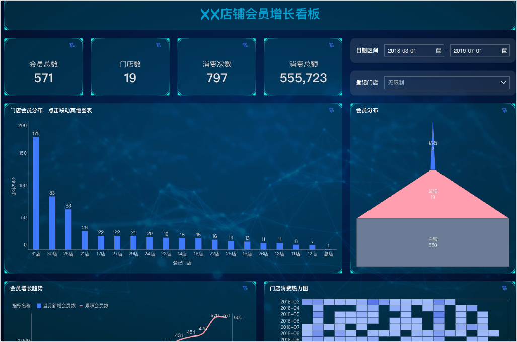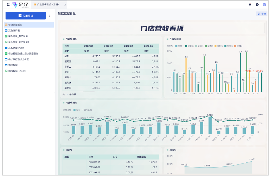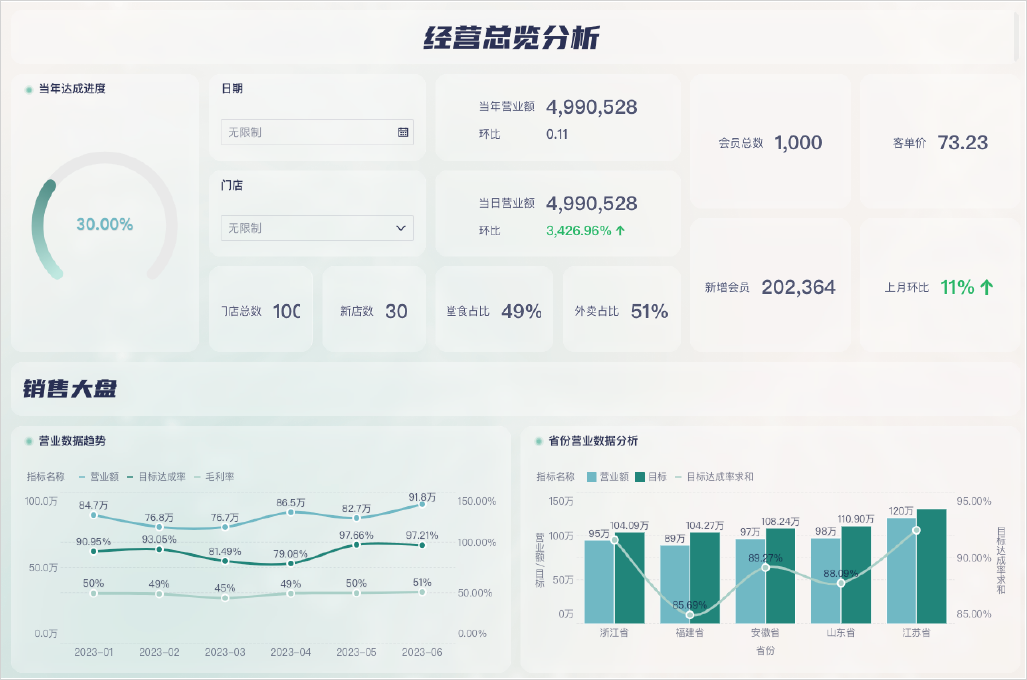 通过简单的拖拽字段即可快速生成各种类型的图表,适用于不同场景的数据展示需求;用户可以将分析结果以图表的形式整合到仪表板中,并设置筛选器功能,实现动态交互。仪表板还支持链接共享,团队协作和信息共享;结合数据变化设计动效,使数据展示变得更具观感,适合会议大屏或日常监控场景使用。