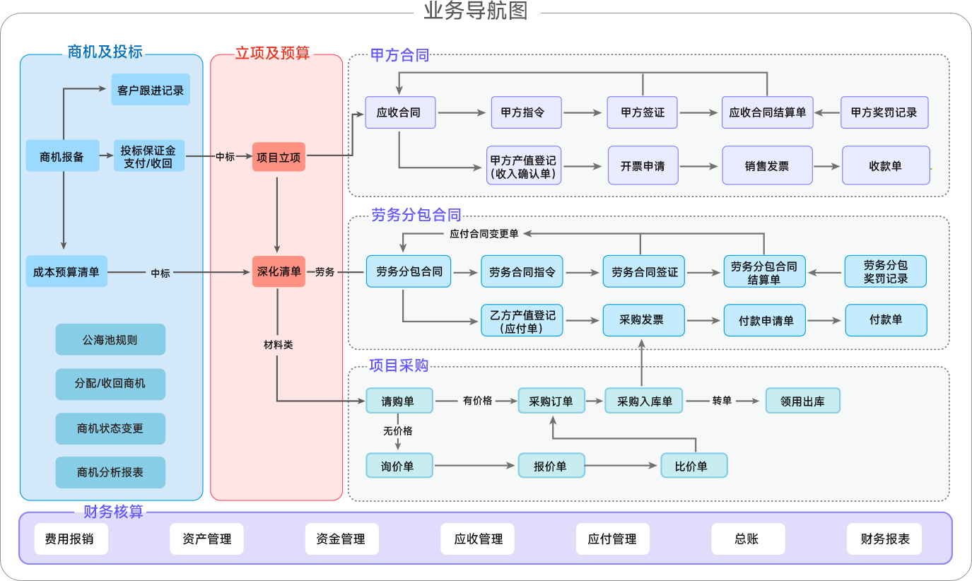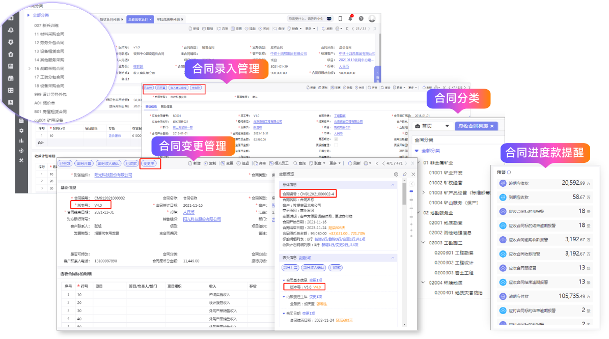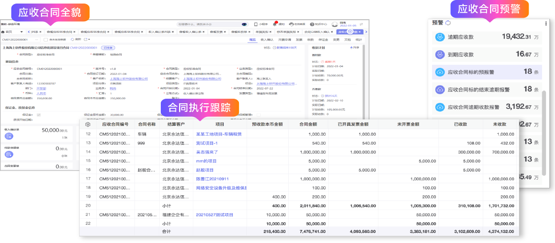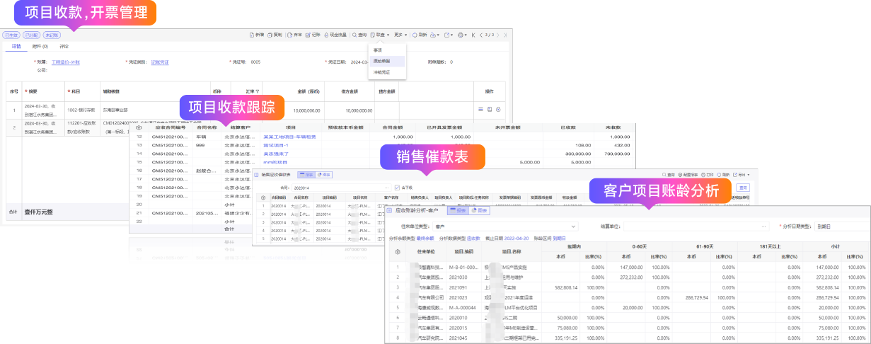 与合同管理和项目管理全面集成,支持发票税务账与收入账分离的账务处理。为企业提供各种往来款项账务处理及查询统计,实现企业往来款项及经营过程的自动预警,避免长期逾期款项造成的不利影响。
