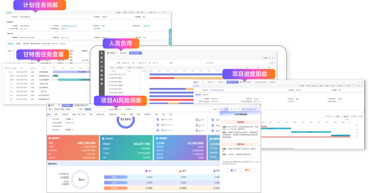 项目预算,项目计划,项目资源,工时和任务管理,360度项目视图,项目财务分析,总结项目得失,促进项目利润提升。