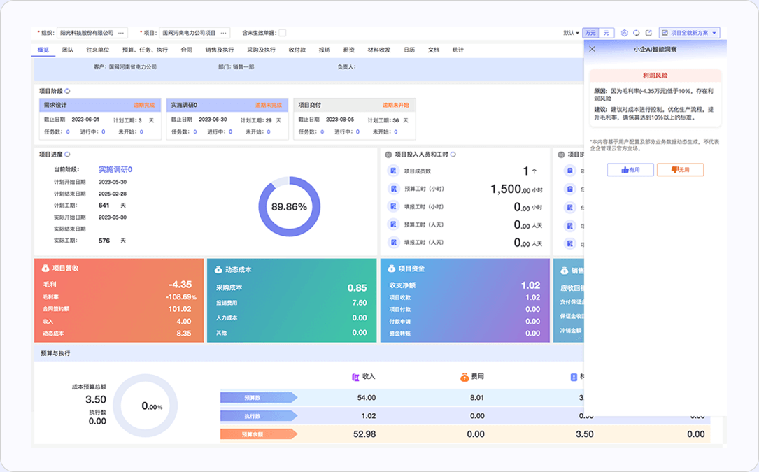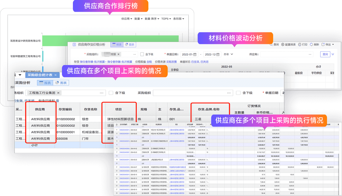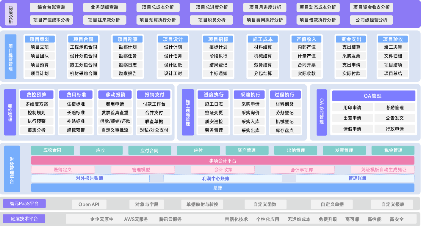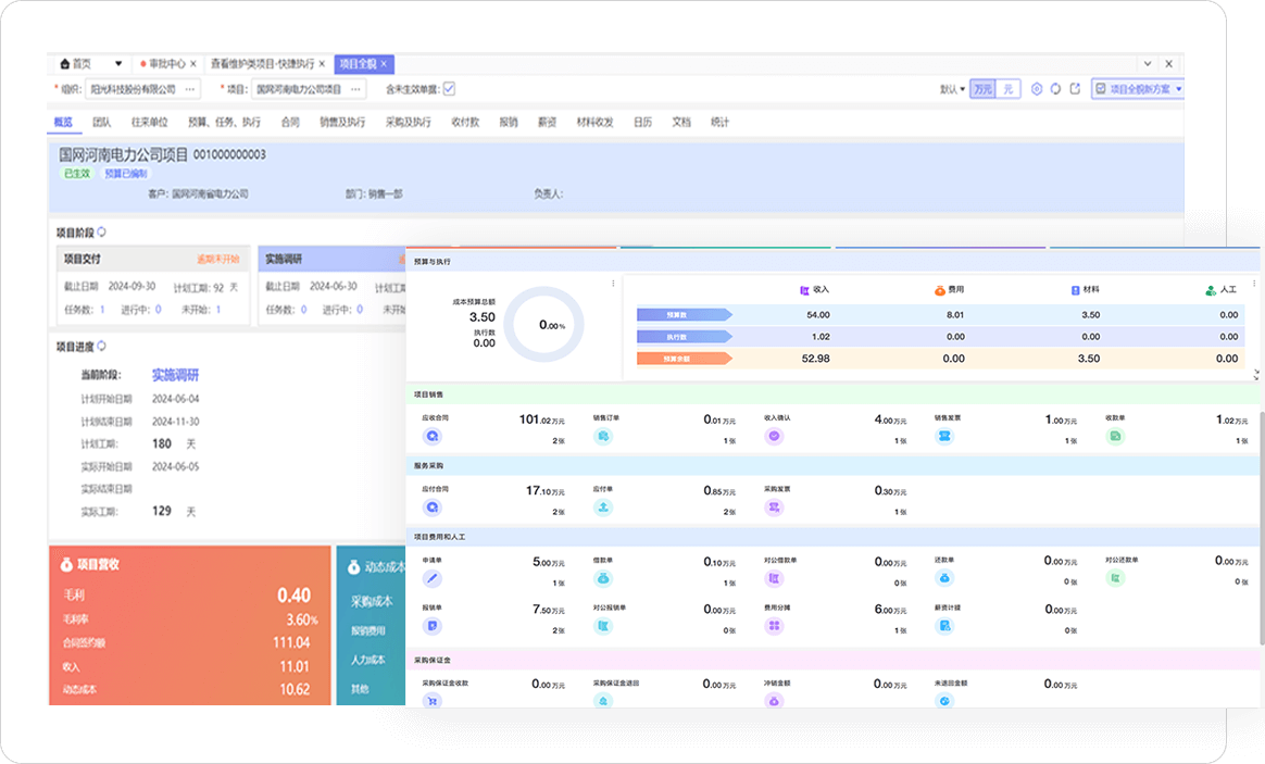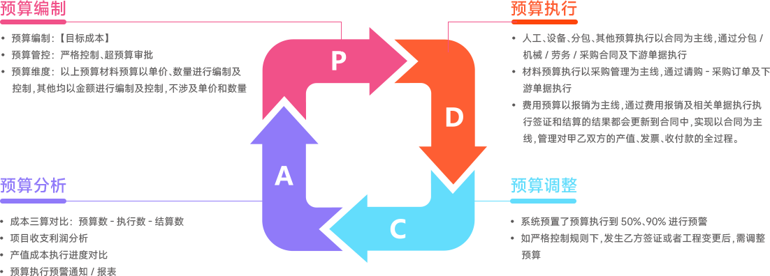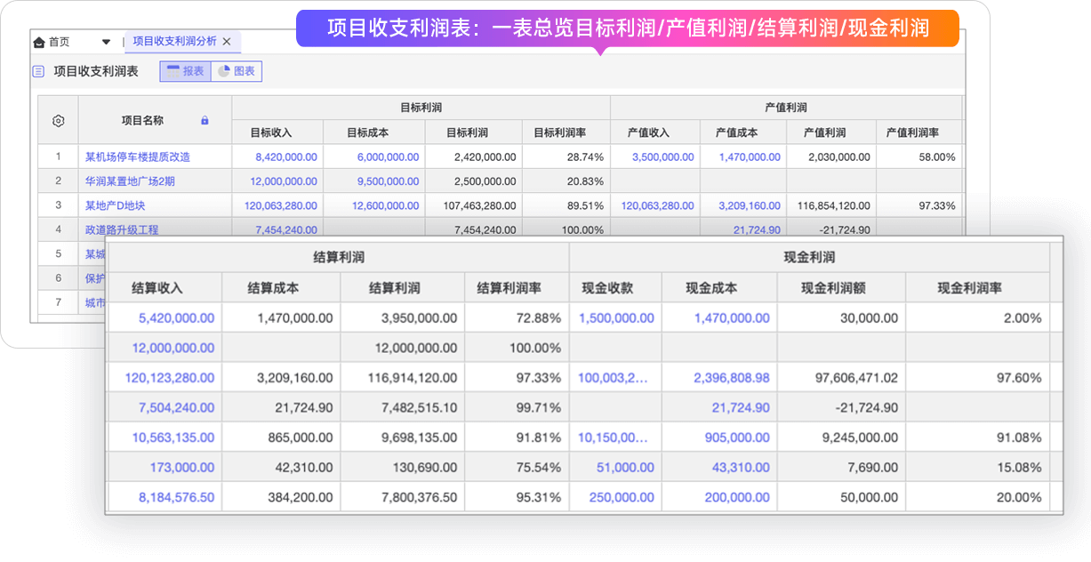 始终以项目为核心,围绕项目实现进度、成本、合同、资金、物资等管理同时,针对项目进行多维度的数据分析进行看板展示,包括项目资金收支、成本、利润分析,从公司、业主、供应商、分包商、人员等维度进行分析,实时动态查询。