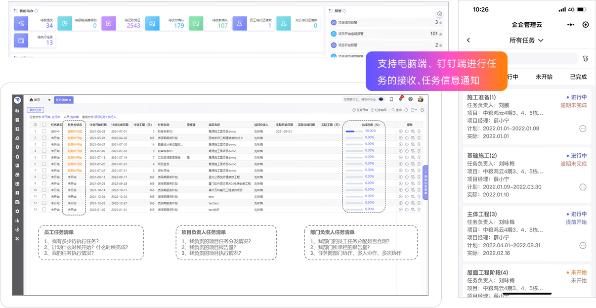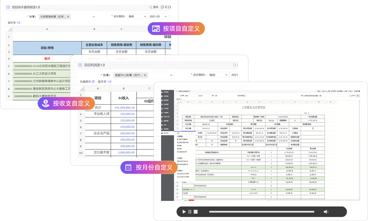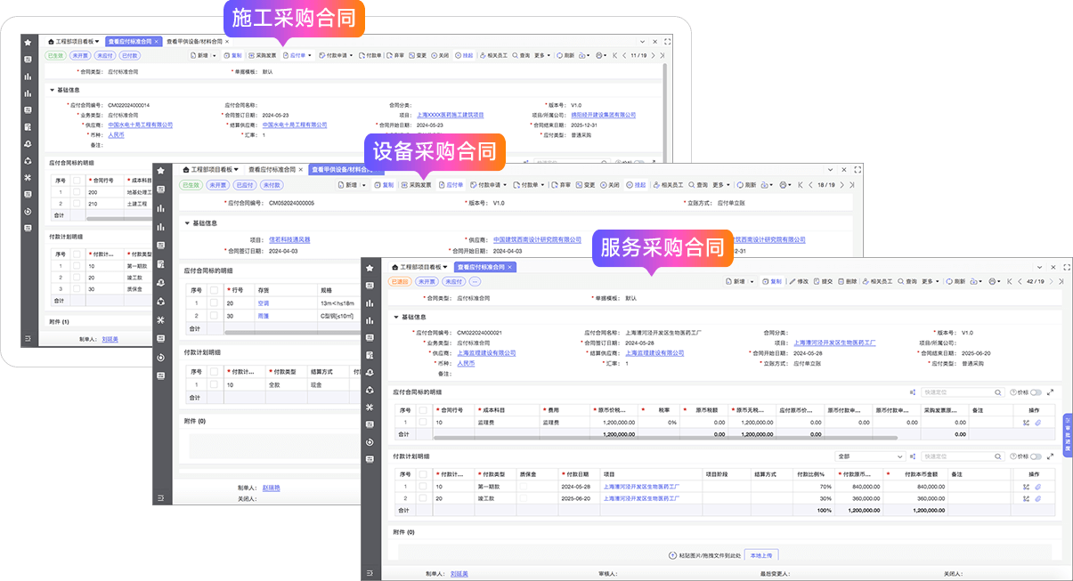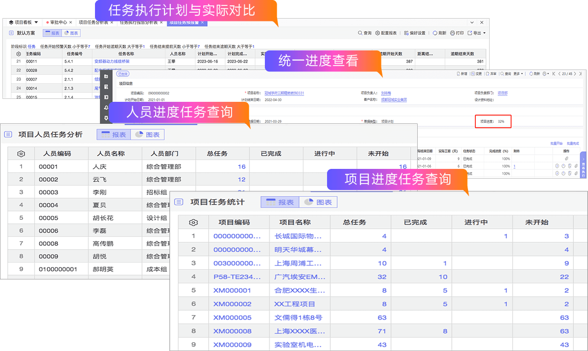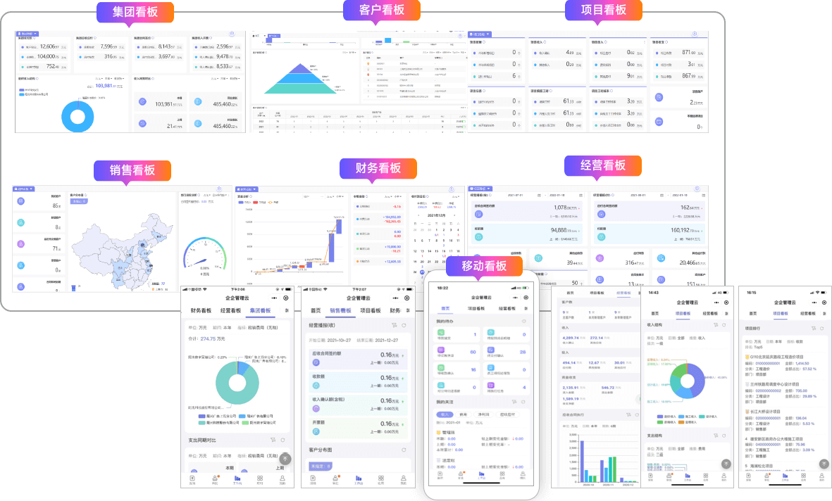 始终以项目为核心,围绕项目实现进度、成本、合同、资金、物资等管理同时,针对项目进行多维度的数据分析进行看板展示,包括项目资金收支、成本、利润分析,从公司、业主、供应商、分包商、人员等维度进行分析,实时动态查询。