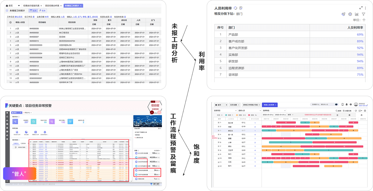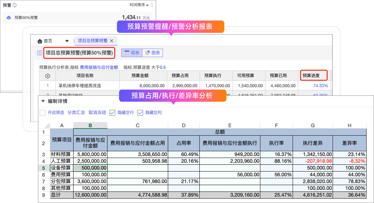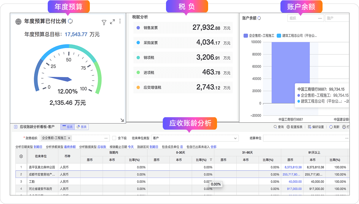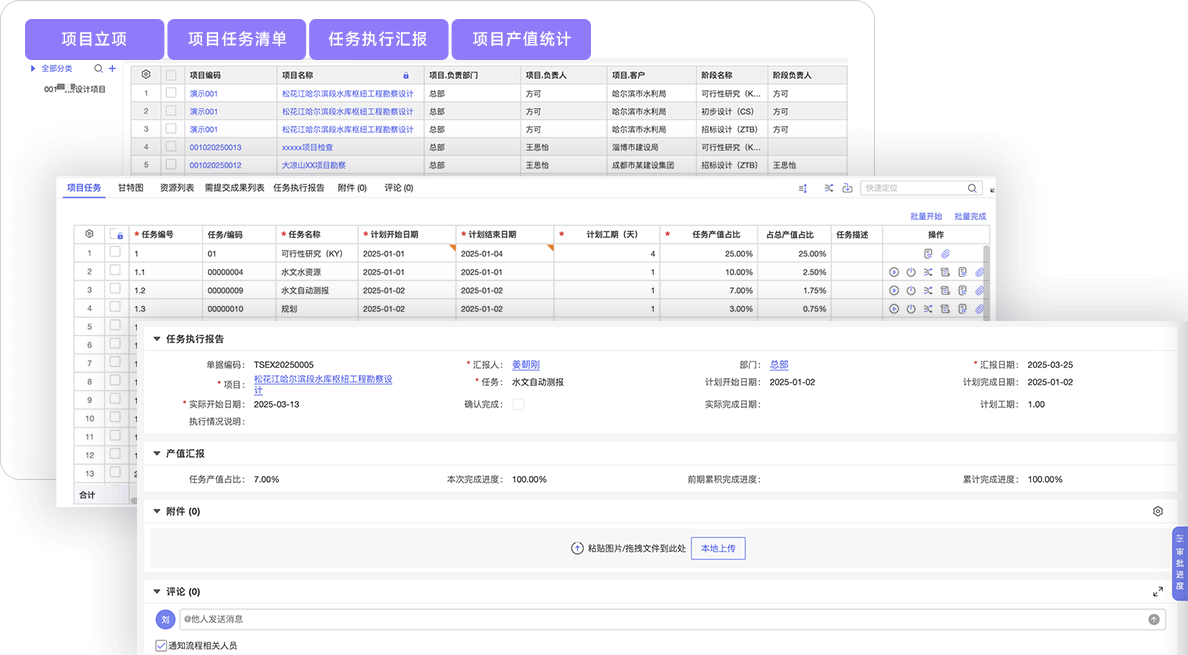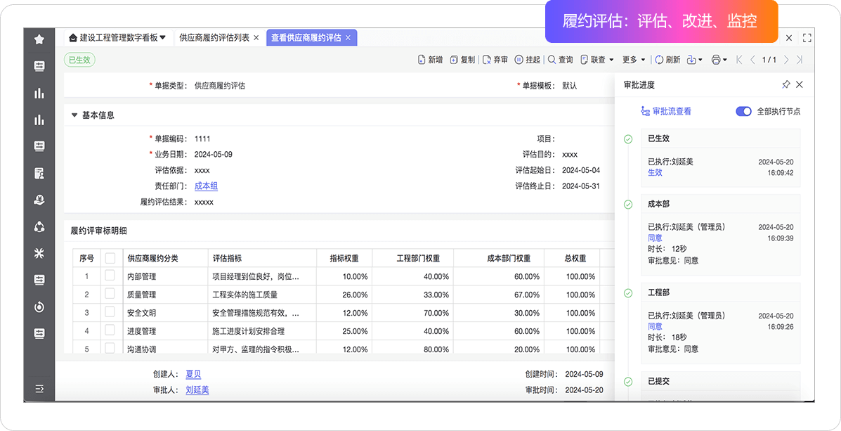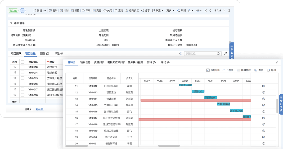 始终以项目为核心,围绕项目实现进度、成本、合同、资金、物资等管理同时,针对项目进行多维度的数据分析进行看板展示,包括项目资金收支、成本、利润分析,从公司、业主、供应商、分包商、人员等维度进行分析,实时动态查询。