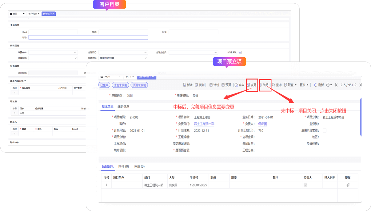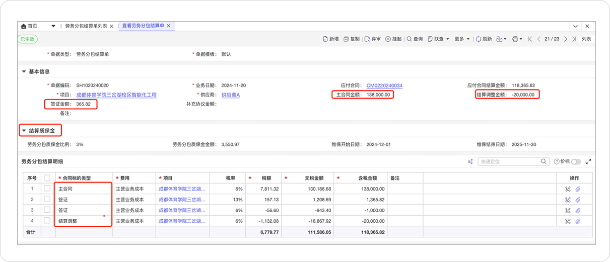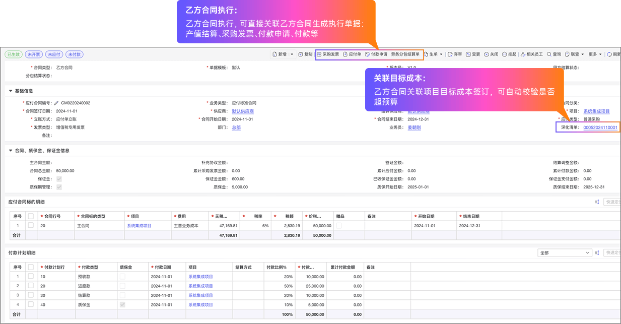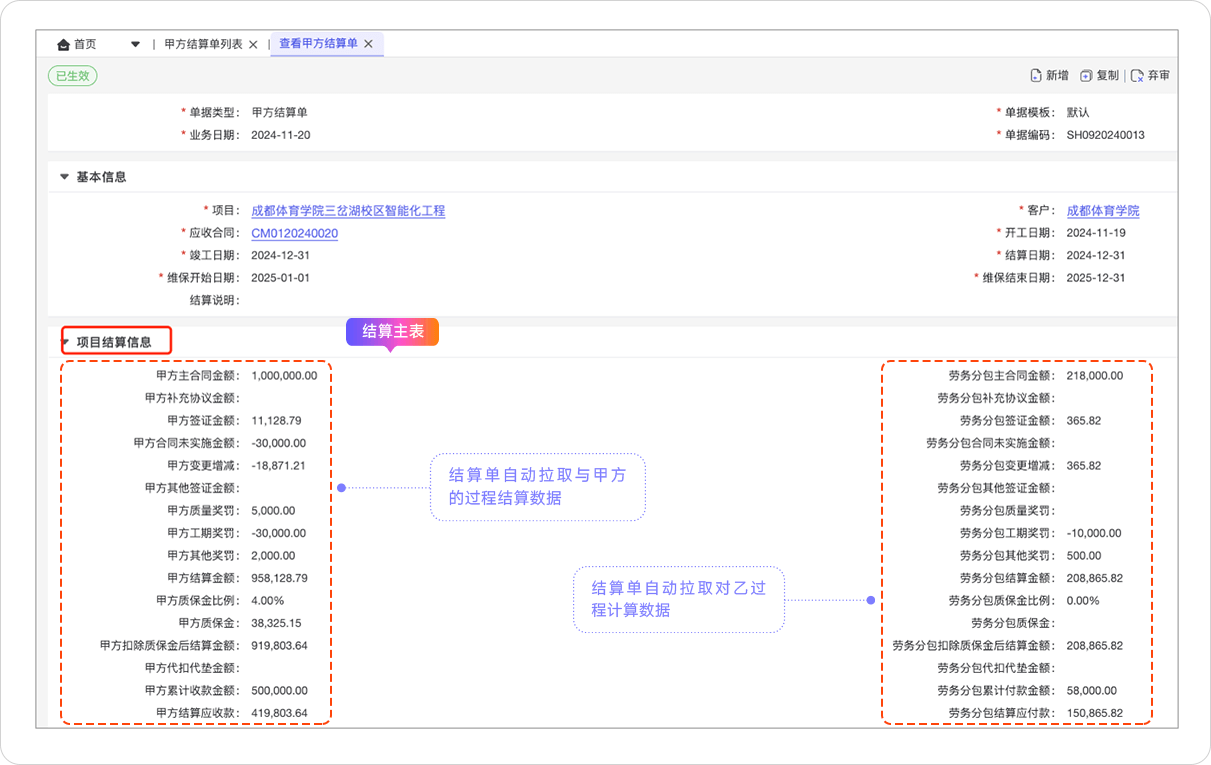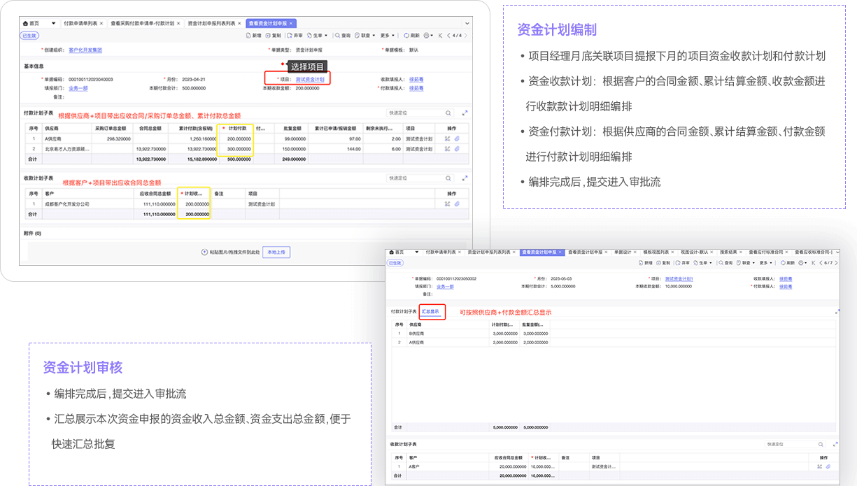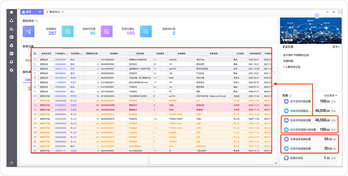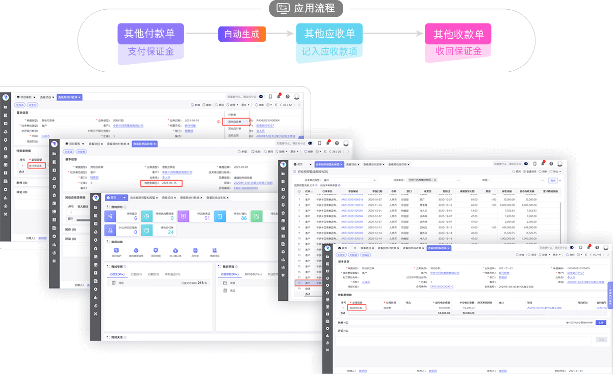 由前端业务推动后端财务,财务实时监控前端业务的进度和资金线,打破业务与财务的孤岛,为企业经营管理提供一套准确的、实时的数据,并可通过财务职能督办业务进度。