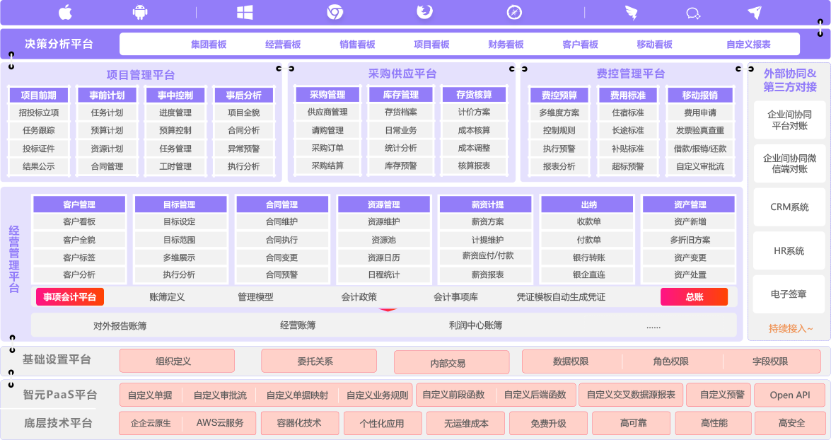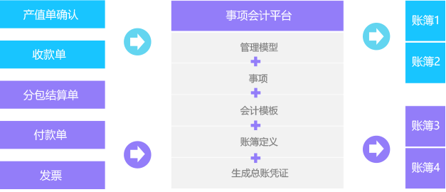 基于事项会计平台,实现项目的收入、应收、应付、收款、付款、费用、费用分摊等业务过程数据实时自动入账