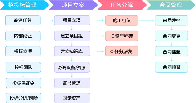 从招投标项目建立到投标跟踪的全过程,风险识别、证书管理、投标阶段管理