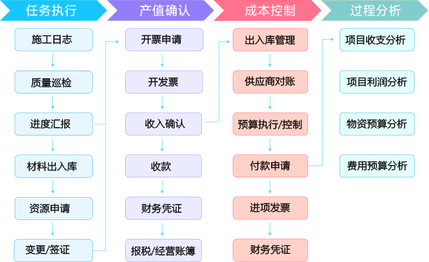 项目的人工成本、材料成本、各类费用实时归集,通过项目预算实时对项目成本控制