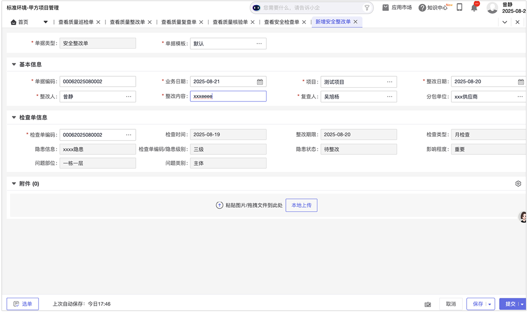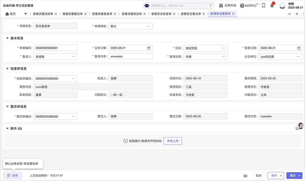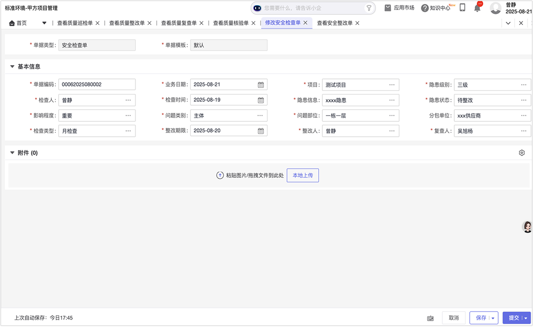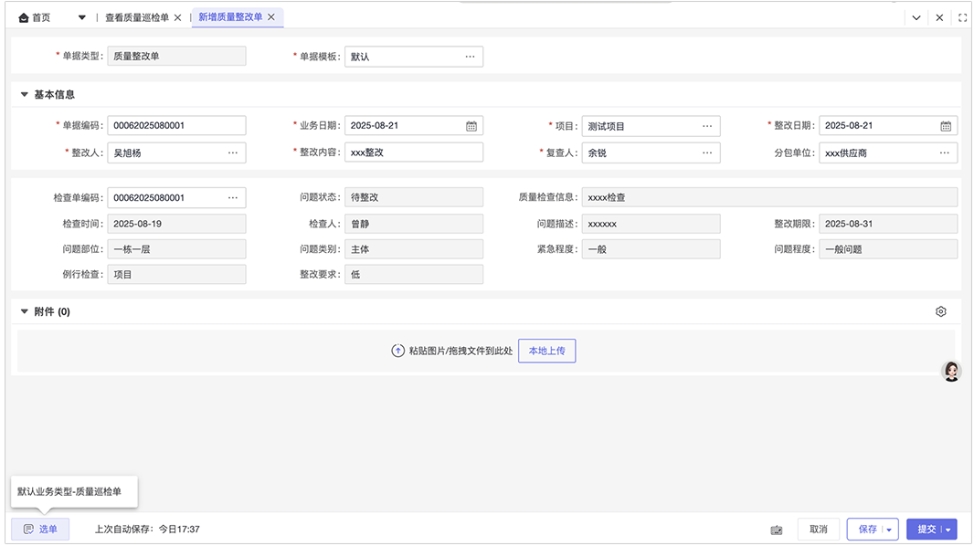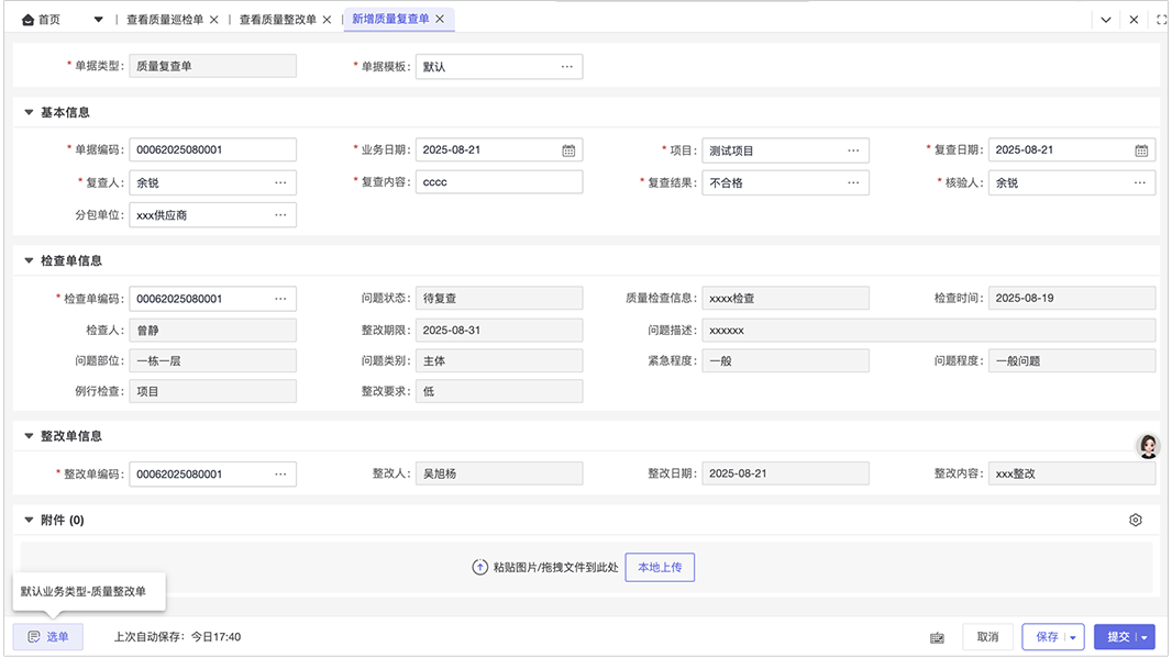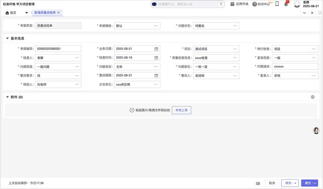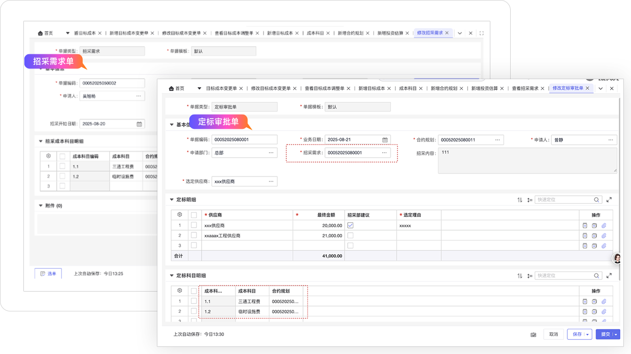 企企服务业ERP通过“招采需求”和“定标审批单”两类自定义单据,实现业主/建设方对招标采购的线上记录与全流程管理。业务部门可发起招采需求并关联合约规划,采购过程透明留痕;完成比选后可提交定标申请,确保供应商选择合规、审批高效,助力企业实现规范化、精细化的招采管理。