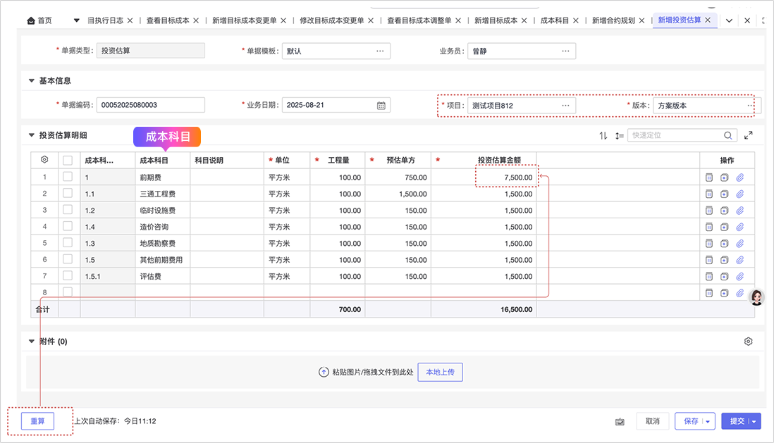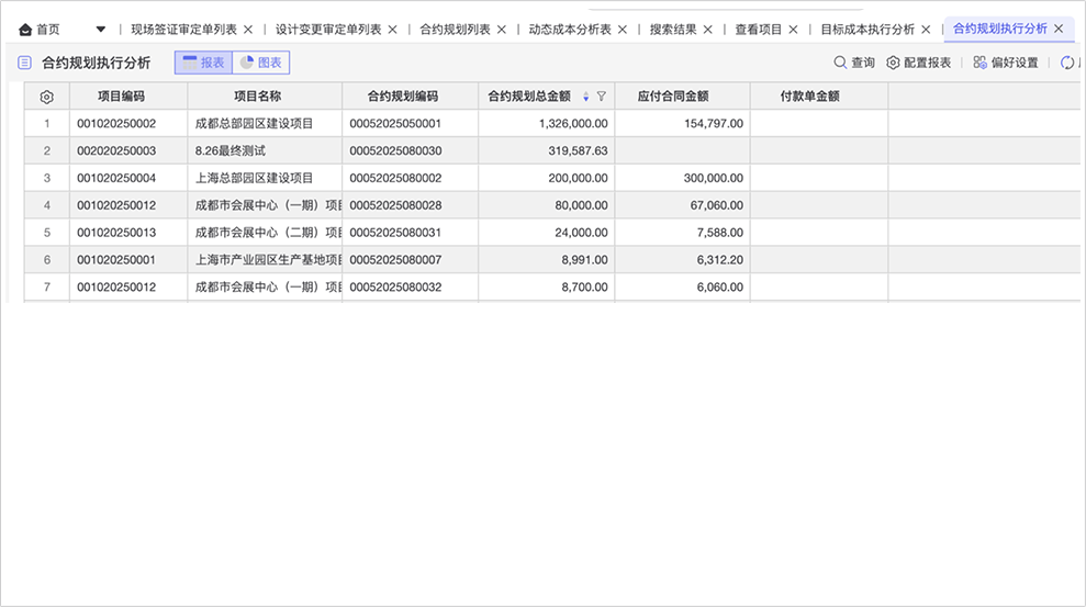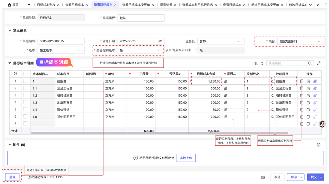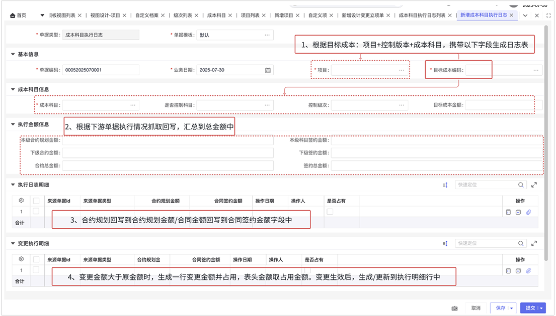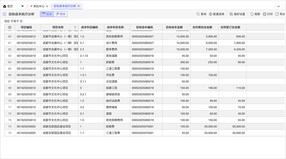 企企服务业ERP通过目标成本控制功能,基于项目+版本+科目生成执行日志,实时记录各类单据的执行金额与变更明细,动态核算剩余可执行额度。帮助业主/建设方实现全过程成本可追溯、可控管,避免超支,确保资金投入合理高效。