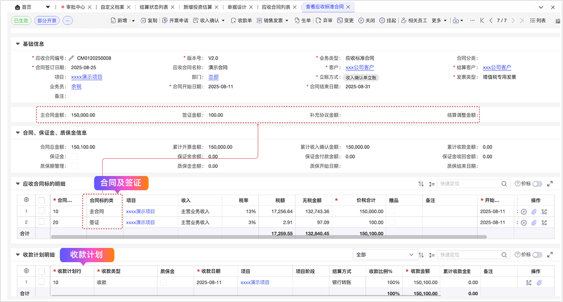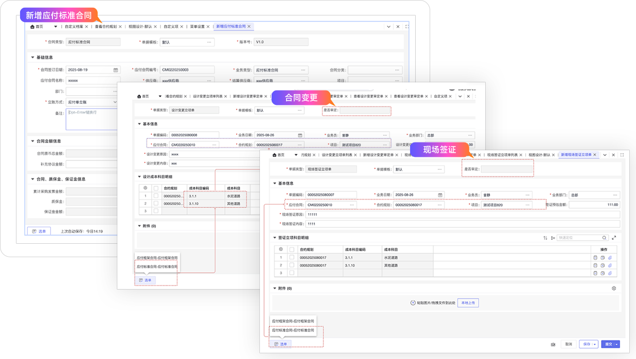 企企服务业ERP在招采结束后支持与供应商的合同签订与全流程变更管理,合同信息可自动关联项目、合约规划和成本科目,提升录入效率。系统覆盖新签、补充协议、设计变更、现场签证、结算调整等多类场景,支持从申请、审批到验收结算的闭环管理,确保合同执行过程规范可控、信息留痕完整,助力业主/建设方实现合同管理的合规化与精细化。