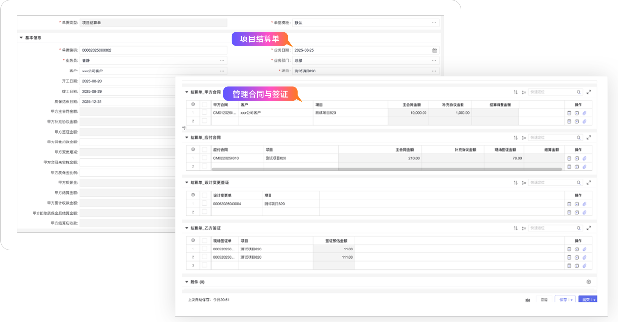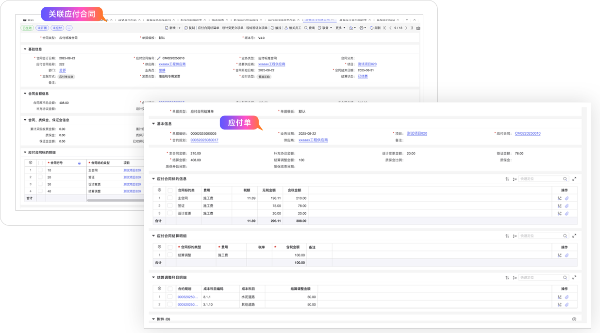 企企服务业ERP支持项目完工后的应付合同结算,自动带入乙方合同及签证执行数据,填报结算金额即可快速核算差异。系统自动回写合同结算金额与状态,实现合同、签证与结算闭环管理,帮助业主/建设方提升供应商结算准确性、合规性与管理效率。
