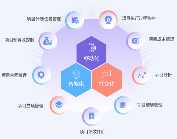 ● 项目管理:完整的项目闭环管理解决方案,包括项目立项、进度计划、资源计划、预算、任务执行、工时汇报、项目成本和项目开票等功能。