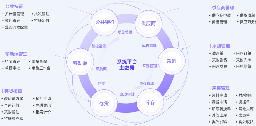● 规范采购过程中的订单、合同、应付、付款等环节,帮助企业提升采购效率。支持自动成本核算,内置多种计价补偿机制,实现智能存货核算。