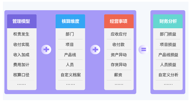 ● 事项管理平台,支持一套业务数据,生成多角度的管理会计模型,既满足企业规范报表报税需要,又充分帮助企业实现各种内部核算需求。