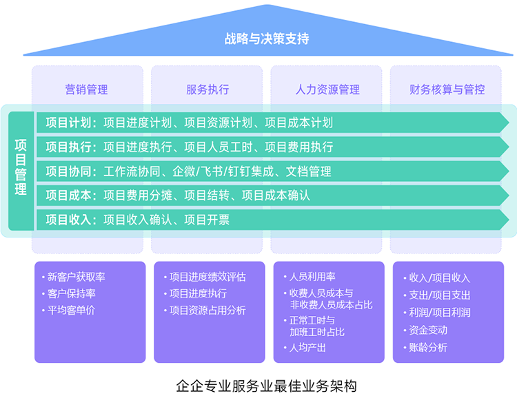 专业服务公司需要基于企业战略,借助数字化工具建立高质量发展的组织和管理体系,以促进战略的有效实施。企企基于服务上千家专业服务公司的经验,总结了最佳业务实践,帮助专业服务公司快速建立支持业务和管理的数字化落地方案。