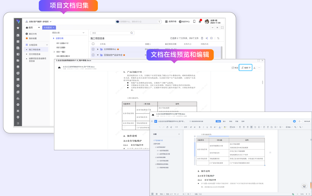 支持文档在线预览和编辑,支持项目文档归集:对项目文档有效管理,促进企业对智力资产的整理、固化和重用。将原本分散在各处的各种产品文档,实现集中统一管理,保证文档的安全性和有效性,同时提供强大的数据查询功能,为实现智力资产的重用提供良好的保障。