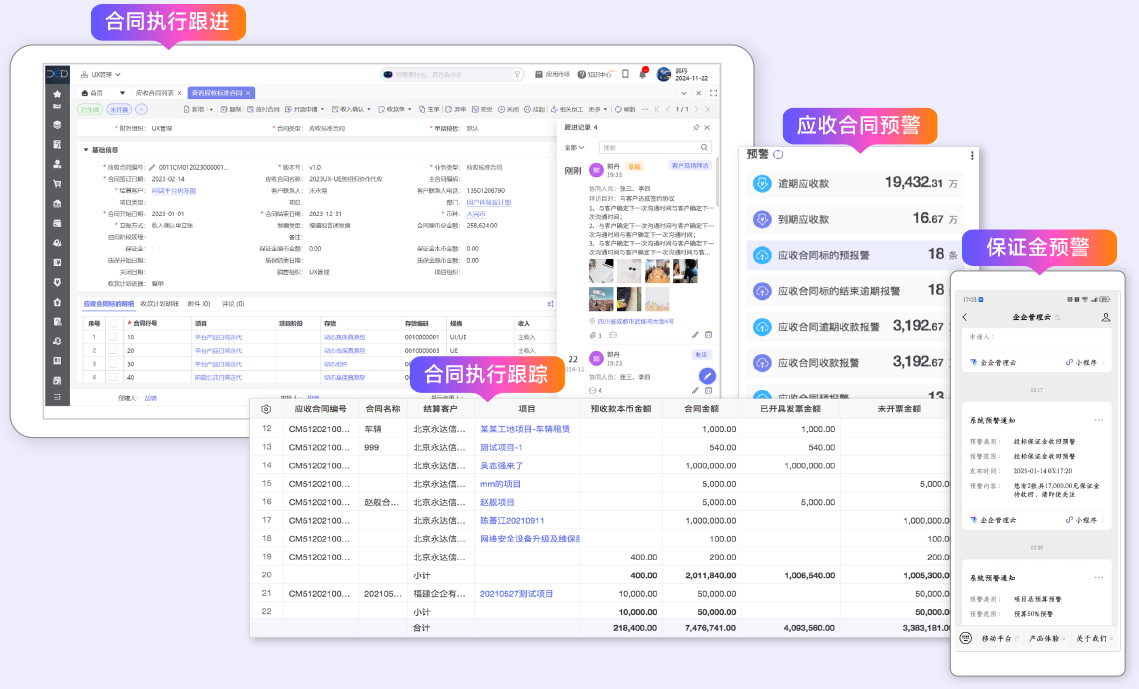 实现项目线索到签约全过程跟进;实现合同的全生命周期管理:合同创建、审批、执行、变更、关闭、分析和预警全流程管理,实时掌握合同财务与进度状况,实现合同规范管控。