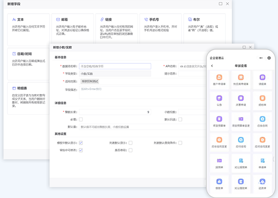 从而满足企业在业务中需要用到的个性化场景如,请假单、入职信息填报、离职申请、用章审批等。支持单据样式自定义,使用客户端自定义。