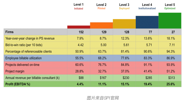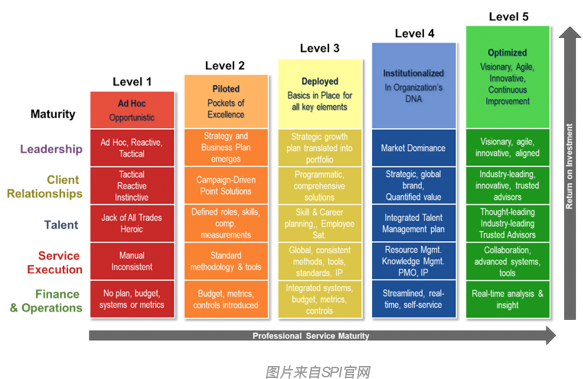SPI的成熟度级别定义可帮助专业服务公司发现其表现不如同行的领域。在某些情况下,这种表现可能是组织战略的结果,例如,弱化服务利润以强调产品销售。
