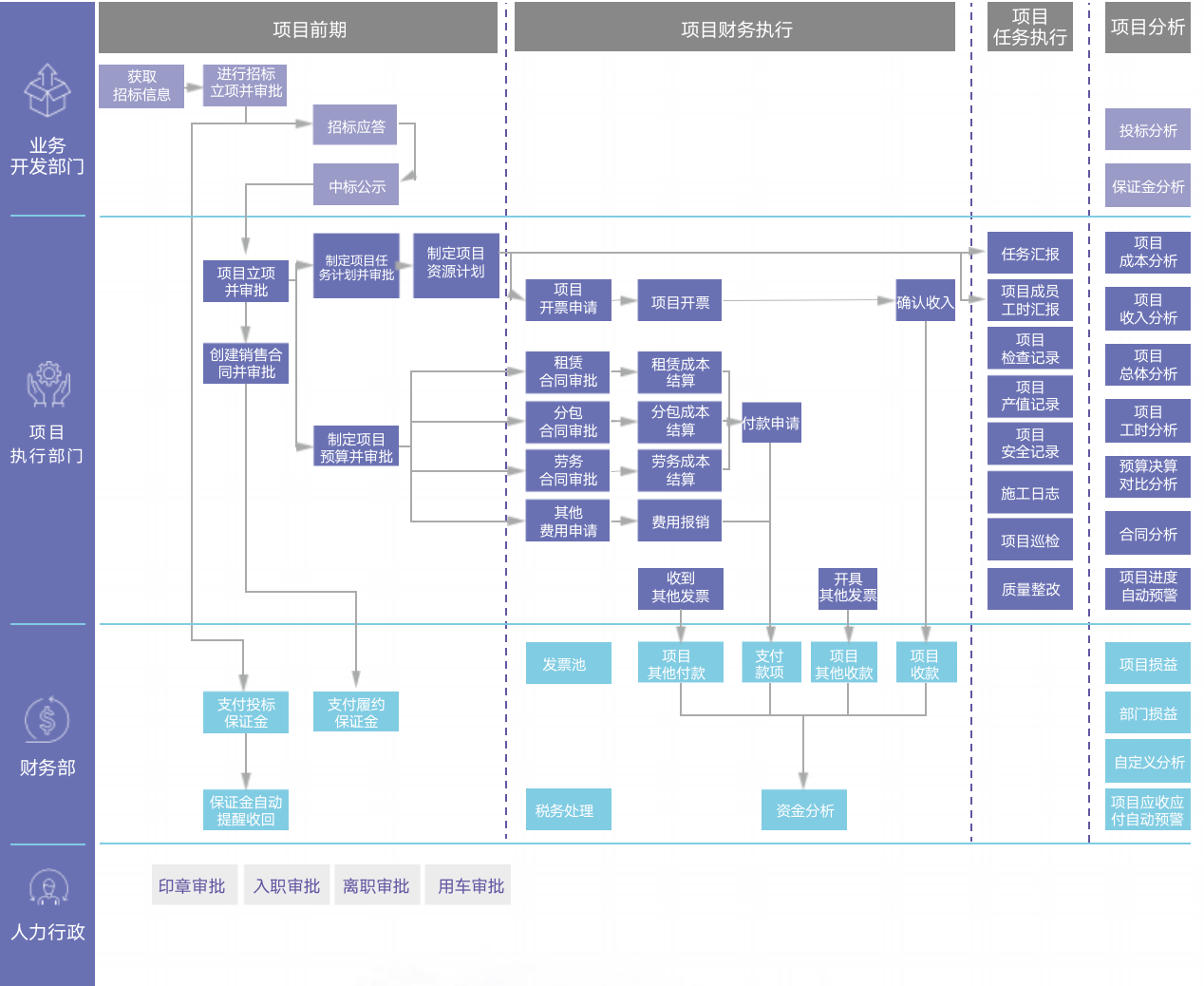 项目相关的全生命周期,同时延伸出组织的其他管理需求,如财务管理、人力资源管理、资产 管理、知识管理、审批协同,报表展示等需求。项目全生命周期管理项目事前规划、项目事中执 行、项目事后总结分析;管理全过程的项目资源、进度、成本费用、质量、资金, 并保证项目执 行过程在计划中可控。