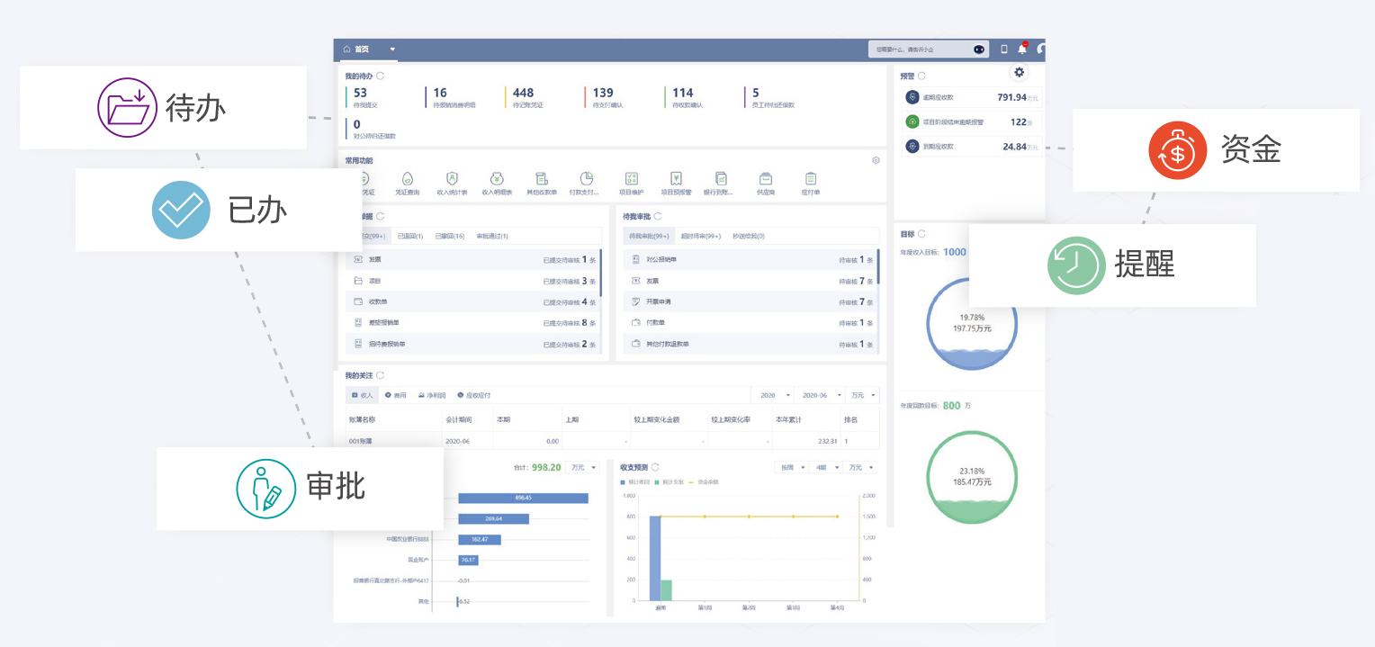 基于角色的个性化配置工作台,待办、已办、审批、目标、资金、预测、提醒等一清二楚。