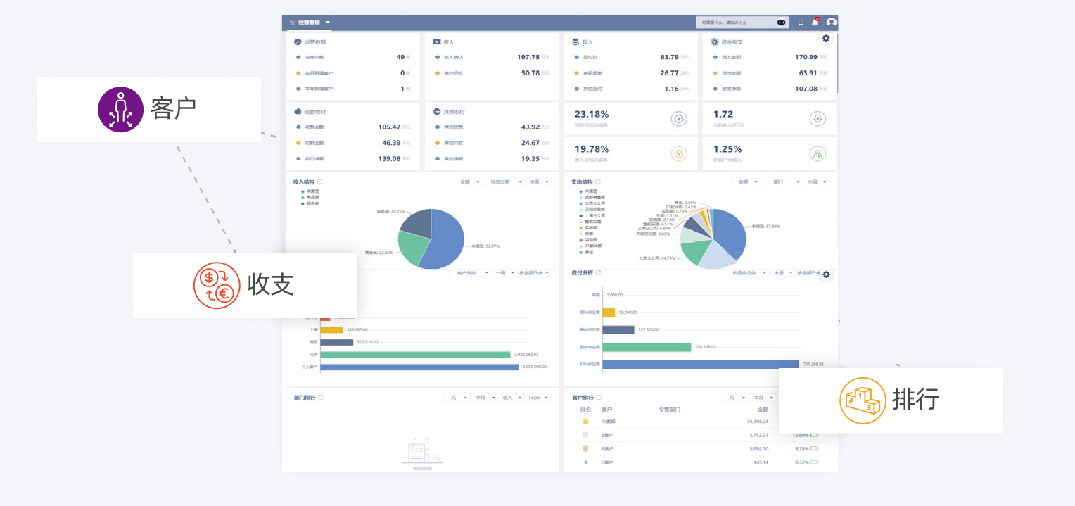 客户、收支、利润、预测、排行等多维度数据分析,实时查看。