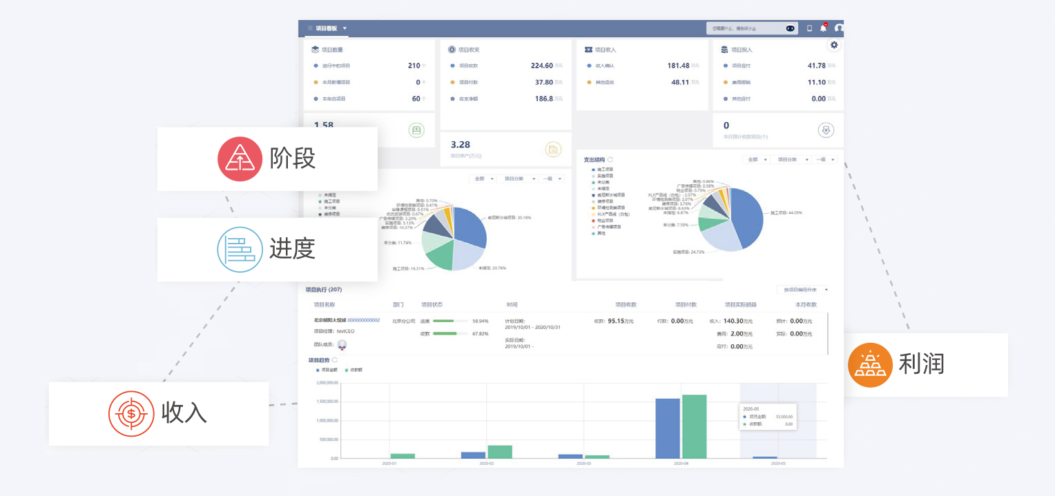 项目阶段、进度、回款、收入、支出、利润等等尽在掌握。