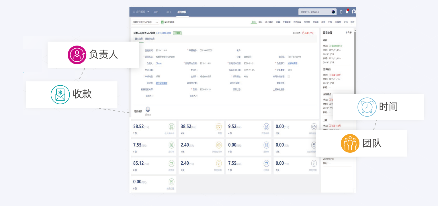 负责人、阶段、时间、收款、付款、团队等。