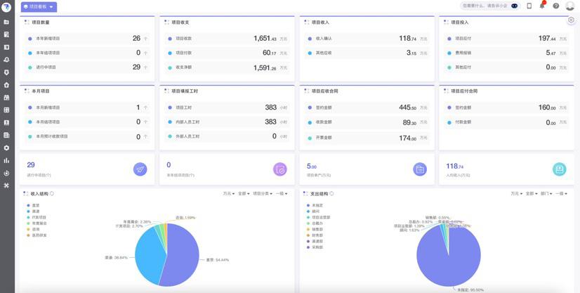 一多维度的项目分析,支持收入、费用、执行、预算进行业务类型、客户、项目、区域、收支等口径多维度的分析;
